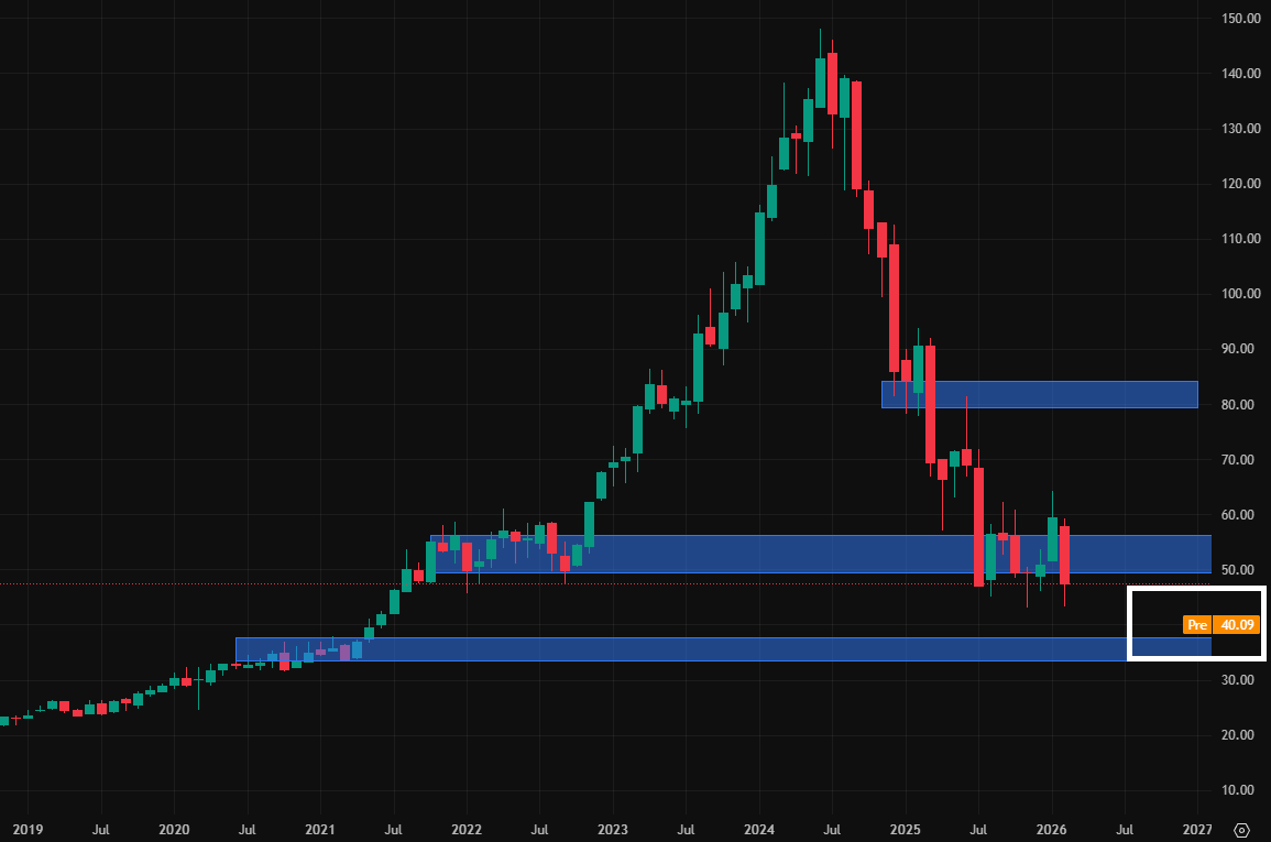 Akcie společnosti Novo Nordisk dnes, tj. 23. února 2026, po otevření trhů v USA spadnou téměř na hodnotu svého posledního supportu. Tímto supportem je tržní konsolidace z roku 2020 až 2021. Zmíněný support svým rozsahem sahá až k cenové úrovni 30 USD. Pokles akcií pod tuto cenu by tak již mohl signalizovat to, že se celá investice protáhne.