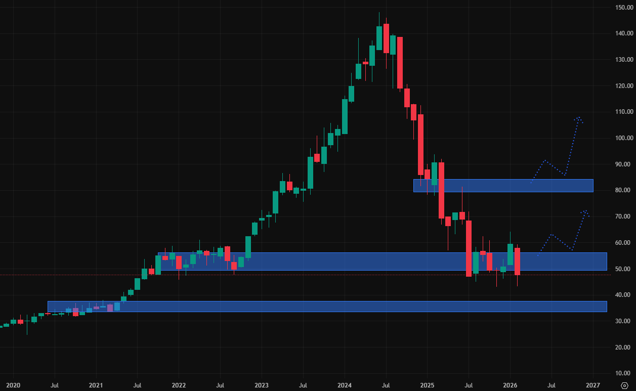 Akcie společnosti Novo Nordisk se stále obchodují v postranním trendu, přičemž začátek února smazal zisky z posledních dvou měsíců. V trhu ovšem i nadále zůstává neotestovaný support kolem 35 USD. Současná konsolidace však zvyšuje pravděpodobnost na jeho proražení. Investoři mohou být opět pozitivní až v okamžiku, kdy akcie prorazí horní hranu konsolidace, tedy nad 70 USD. Nicméně i tam jsou silné rezistence, které mohou akciím bránit v jejich dalším růstu.