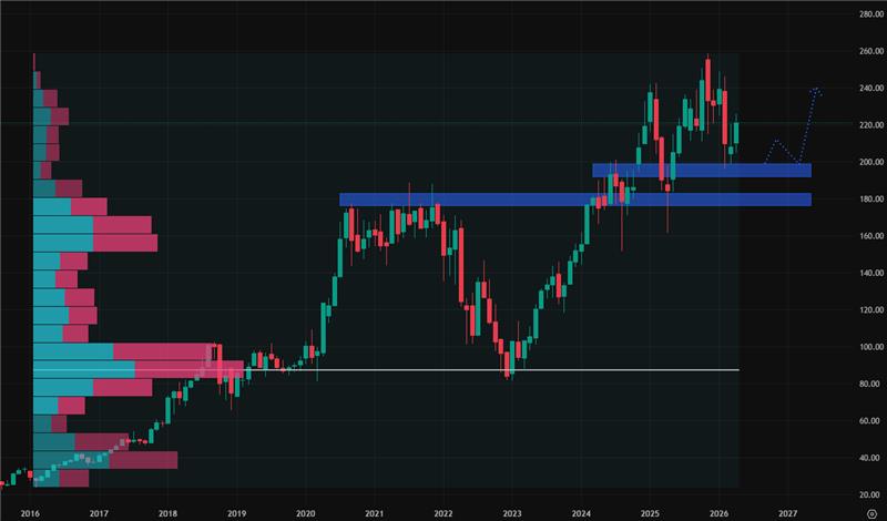 Vypadá to, že akcie společnosti Amazon provedly pouze menší pullback a odrážejí se od hodnoty nejbližšího supportu na hodnotě 200 USD. Pokud jim bude globální investiční prostředí přát a situace ohledně geopolitiky se ustálí, nebrání jim v růstu žádná technická rezistence. Akcie tak mají otevřené dveře k výraznějšímu růstu a možná se investoři dočkají i tvorby nových cenových maxim.
