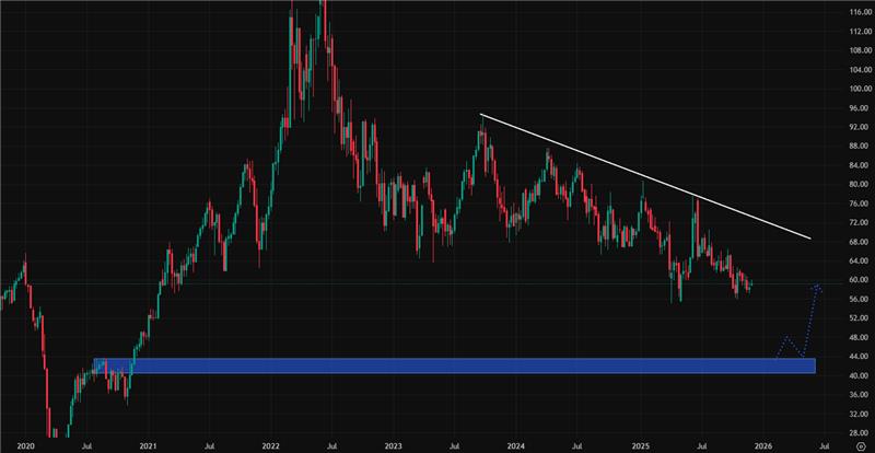 Ropa se obchoduje pod hodnotou klesající trendové čáry. Prozatím na cenovém grafu nic nesignalizuje, že by měl nastat obrat trendu. Nejbližší support, který ještě nebyl otestován, se nachází až na ceně 40 USD. Zajímavé je, že se jedná o tržní konsolidaci už z roku 2020.