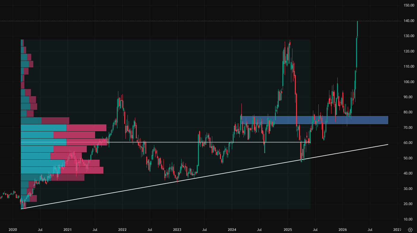 Akcie společnosti Marvell po dorazu od supportu na hodnotě 80 USD vystřelily směrem vzhůru, přičemž ignorovaly veškeré rezistence a nakonec i cenové maximum. Z toho je nyní nejbližší support, na který mohou akcie provést pullback před tím, než by pokračovaly směrem v růstu.