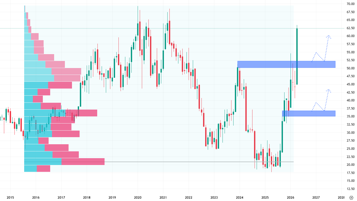 Akcie společnosti Intel předvedly parádní jízdu ze swingových maxim, kdy je mnoho investorů zatracovalo, až po současné valuace v oblasti předchozích maxim. Z poražených rezistencí na hodnotě 50 USD a 35 USD jsou tak nyní nejbližší supporty. Pokud akcie poletí stále vzhůru a překonají maximum na 70 USD, otevře se jim růstový potenciál k historickým maximům z roku 2000 okolo 76 USD za akcii.