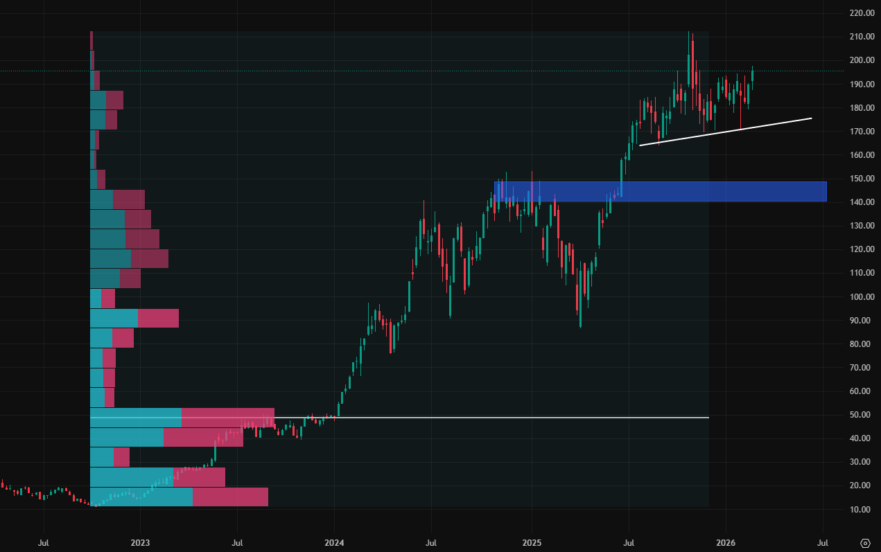 Akcie společnosti Nvidia se obchodují nad hodnotou krátkodobější rostoucí trendové čáry. Tento pattern obvykle předchází volatilnímu cenovému pohybu, což by v jejich případě mohlo značit průraz na nové historické cenové maximum. Nejbližší support se nachází okolo 150 USD, ale zatím nic nenasvědčuje, že by jej akcie měly jít otestovat.