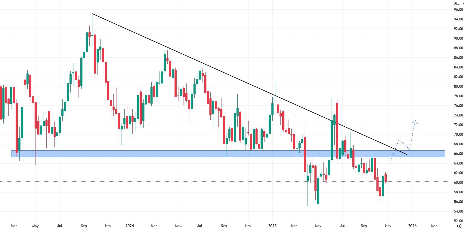 Pokud však sankce budou skutečně hluboké a dlouhodobé, může to vyvolat tlak na rafinérské řetězce a zvýšit ceny pohonných hmot. Prozatím se cena ropy obchoduje pod rezistencí na ceně 65 USD. Průraz této rezistence by zároveň znamenal průraz trendové čáry. V případě, že by se tak stalo, došlo by ke změně sentimentu a možnému dlouhodobějšímu cenovému růstu.